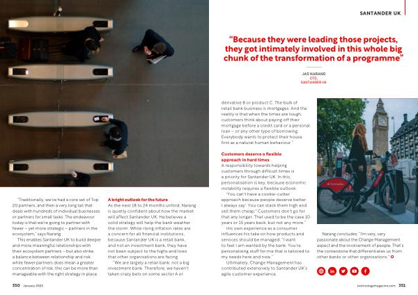 JAS NARANG CTO , SANTANDER UK derivative B or product C . The bulk of retail bank business is mortgages . And the reality is that when the times are tough , customers think about paying off their mortgage before a credit card or a personal loan – or any other type of borrowing . Everybody wants to protect their house first as a natural human behaviour .”