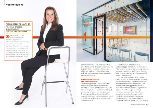 Head of Cloud Infrastructure at VodafoneZiggo , Diana Geels de Koos , says : “ Our mission is ‘ enjoyment and progress with every connection ’, so we focus on the part where we connect and aim for exceptional customer experience .”
