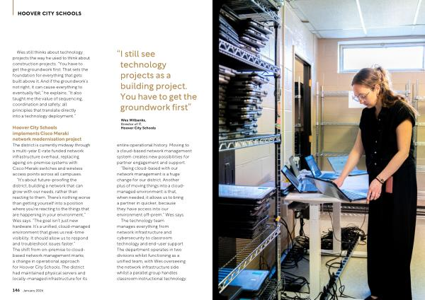 Hoover City Schools implements Cisco Meraki network modernisation project The district is currently midway through a multi-year E-rate funded network infrastructure overhaul, replacing ageing on-premise systems with Cisco Meraki switches and wireless access points across all campuses.“ It’ s about future-proofing the district, building a network that can grow with our needs, rather than reacting to them. There’ s nothing worse than getting yourself into a position where you’ re reacting to the things that are happening in your environment,” Wes says.“ The goal isn’ t just new hardware. It’ s a unified, cloud-managed environment that gives us real-time visibility. It should allow us to respond and troubleshoot issues faster.” The shift from on-premise to cloudbased network management marks a change in operational approach for Hoover City Schools. The district had maintained physical servers and locally-managed infrastructure for its