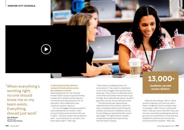 “ Without even asking, I had a C-Spire systems engineer just show up, with a team of engineers and our project lead on standby. I didn’ t have to call and ask them. They just came. We didn’ t have any hiccups, everything worked great and we got a lot of compliments on how fast and reliable the network was in those four schools and their students,” Wes says.