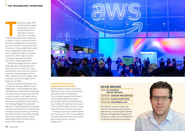 David’ s responsibilities span EC2, containers, Lambda, Bedrock and SageMaker – the foundational layer that determines whether AI workloads run efficiently or expensively. During re: Invent week in Las Vegas, where AWS announced both its Trainium3 accelerator and Graviton5 processor, Technology Magazine spoke with David on chip development timelines, the physics constraints of distributing training clusters and why controlling the full stack from chip design through data centre deployment creates advantages that merchant silicon alone cannot deliver.
