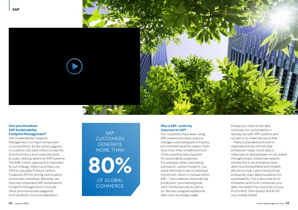 Why is ERP- centricity important to SAP? Our customers have been using ERP systems for many years to manage corporate goals in finance, procurement and the supply chain. Over time, they’ ve defined much of the essential data required for sustainability purposes. For example, when calculating a product’ s carbon footprint, you need information about materials movement, which is tracked within ERP – how materials move during production, purchased goods, semi-finished products and so on. We also integrate additional data, such as energy usage.