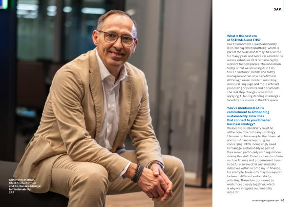 You’ ve mentioned SAP’ s commitment to embedding sustainability. How does that connect to your broader business strategy? We believe sustainability must be at the core of a company’ s strategy. This means, for example, that financial and non-financial reporting are converging. CFOs increasingly need to manage sustainability as part of their remit, particularly with regulations driving this shift. Core business functions such as finance and procurement have to be fully aware of all sustainability initiatives within a company. In finance, for example, trade-offs may be required between different sustainability activities. These functions need to work more closely together, which is why we integrate sustainability into ERP. technologymagazine. com 65