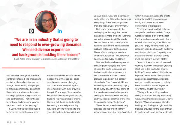 you will excel . Also , find a company culture that you fit in with – it changes everything . There ’ s nothing worse than the wrong work environment .” Keller was drawn more to the underlying technology that made data centers more efficient : “ Starting out in the International Standards bodies , I was able to participate in early industry efforts to standardize grid and datacenter technologies . Those efforts really prepared me when for future roles I would take at Facebook , Workday , and Uber .”