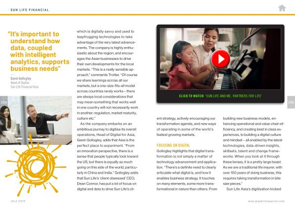 — Gavin Gollogley , Head of Digital , Sun Life Financial Asia which is digitally savvy and used to leapfrogging technologies to take advantage of the very latest advancements . The company is highly enthusiastic about the region , and encourages the Asian businesses to drive their own developments for the local markets . “ This is a really sensible approach ,” comments Trotter . “ Of course we share learnings across all our markets , but a one-size-fits-all model across countries rarely works – there are always local considerations that may mean something that works well in one country will not necessarily work in another : regulation , market maturity , culture etc .”