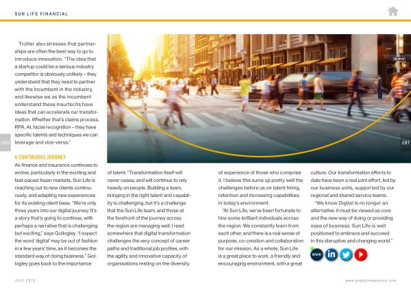 As finance and insurance continues to evolve , particularly in the exciting and fast-paced Asian markets , Sun Life is reaching out to new clients continuously , and adapting new experiences for its existing client base . “ We ’ re only three years into our digital journey . It ’ s a story that ’ s going to continue , with perhaps a narrative that is challenging but exciting ,” says Gollogley . “ I expect the word ‘ digital ’ may be out of fashion in a few years ’ time , as it becomes the standard way of doing business .” Gollogley goes back to the importance of talent : “ Transformation itself will never cease , and will continue to rely heavily on people . Building a team , bringing in the right talent and capability is challenging , but it ’ s a challenge that the Sun Life team , and those at the forefront of the journey across the region are managing well . I read somewhere that digital transformation challenges the very concept of career paths and traditional job profiles , with the agility and innovative capacity of organisations resting on the diversity