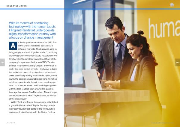 A s the largest human resources ( HR ) firm in the world , Randstad operates 38 different markets . The business aims to bring people and work together whilst “ combining technology with the human touch ,” reveals Richard Tanaka , Chief Technology Innovation Officer of the company ’ s Japanese division . As CTIO , Tanaka defines his position as very unique : “ Innovation is really the core part of my role . I find ways to bring innovation and technology into the company , and we ’ re specifically aiming to do that in Japan , which is why the position was established here . It ’ s not so much an operational role as it is more a strategic one . I do not work alone . I work and align together with the tech leaders from around the globe to leverage that we are One Randstad . There is huge collaboration at the APAC regional level , as well as at the global level .”