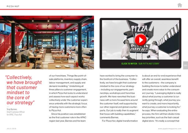 — Troy Barnes , Chief Customer Officer for APAC , Pizza Hut of our franchises . Things like point-ofsale platforms , inventory supply chain , labour management , and supply and demand modelling .” Underlining all three pillars is customer engagement , in which Pizza Hut looks to understand and assess how each aspect works collectively under the customer experience umbrella with the strategic focus of having more customers more often to Pizza Hut .