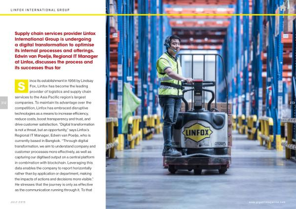 Fox , Linfox has become the leading provider of logistics and supply chain services to the Asia Pacific region ’ s largest companies . To maintain its advantage over the competition , Linfox has embraced disruptive technologies as a means to increase efficiency , reduce costs , boost transparency and trust , and drive customer satisfaction . “ Digital transformation is not a threat , but an opportunity ,” says Linfox ’ s Regional IT Manager , Edwin van Poelje , who is currently based in Bangkok . “ Through digital transformation , we aim to understand company and customer processes more effectively , as well as capturing our digitised output on a central platform in combination with blockchain . Leveraging this data enables the company to report horizontally rather than by application or department , making the impacts of actions and decisions more visible .” He stresses that the journey is only as effective as the communication running through it . To that