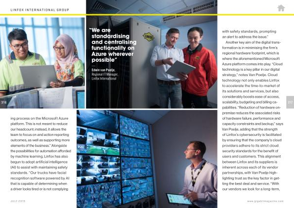 Another key aim of the digital transformation is in minimising the firm ’ s regional hardware footprint , which is where the aforementioned Microsoft Azure platform comes into play . “ Cloud technology is a key pillar in our digital strategy ,” notes Van Poelje . Cloud technology not only enables Linfox to accelerate the time-to-market of its solutions and services , but also considerably boosts ease of access , scalability , budgeting and billing capabilities . “ Reduction of hardware onpremise reduces the associated risks of hardware failure , performance and capacity constraints and backup ,” says Van Poelje , adding that the strength of Linfox ’ s cybersecurity is facilitated by ensuring that the company ’ s cloud providers adhere to its strict cloud security standards for the benefit of users and customers . This alignment between Linfox and its suppliers is inherent across each of its vendor partnerships , with Van Poelje highlighting trust as the key factor in getting the best deal and service . “ With our vendors we look for a long-term ,