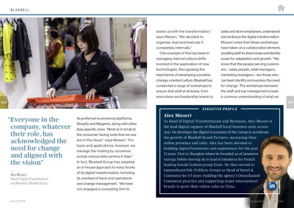 — Alex Misseri , Head of Digital Transformation and Revenues , Bluebell Group its preferred ecommerce platforms , Shopify and Magento , along with other Asia-specific ones . “ Most of , it not all of , the consumer-facing tools that we use are in the cloud ,” says Misseri . “ For back-end applications , however , we manage the hosting by ourselves across various data centres in Asia .” In fact , Bluebell Group has adopted an in-house approach to many facets of its digital transformation , including its overhaul of back-end operations and change management . “ We have not engaged a consulting firm to