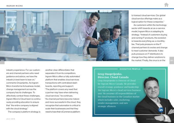 Greg Onoprijenko is Director of Cloud for Ingram Micro Canada . He provides overall strategy , guidance and leadership for Ingram Micro ’ s cloud services business unit . He assumes all responsibilities of the cloud business in the Canadian market which includes sales , marketing , vendor management , and new strategic alliances . www . gigabitmagazine . com