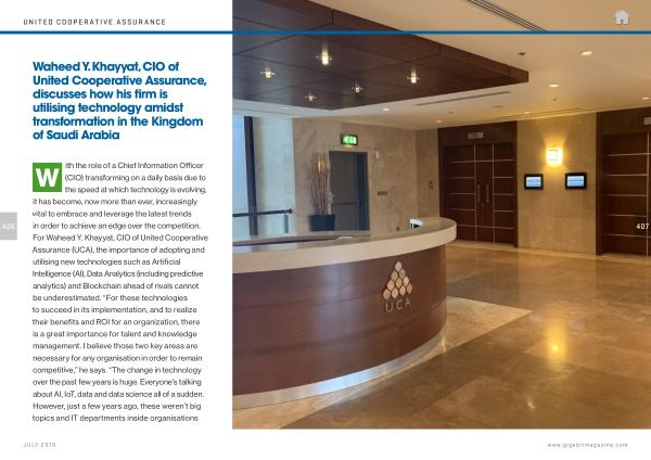 W ith the role of a Chief Information Officer ( CIO ) transforming on a daily basis due to the speed at which technology is evolving , it has become , now more than ever , increasingly vital to embrace and leverage the latest trends in order to achieve an edge over the competition . For Waheed Y . Khayyat , CIO of United Cooperative Assurance ( UCA ), the importance of adopting and utilising new technologies such as Artificial Intelligence ( AI ), Data Analytics ( including predictive analytics ) and Blockchain ahead of rivals cannot be underestimated . “ For these technologies to succeed in its implementation , and to realize their benefits and ROI for an organization , there is a great importance for talent and knowledge management . I believe those two key areas are necessary for any organisation in order to remain competitive ,” he says . “ The change in technology over the past few years is huge . Everyone ’ s talking about AI , IoT , data and data science all of a sudden . However , just a few years ago , these weren ’ t big topics and IT departments inside organisations