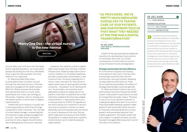 “ AS PROVIDERS , WE ' VE PRETTY MUCH DEDICATED OURSELVES TO TAKING CARE OF OUR PATIENTS . AND OUR PATIENTS TOLD US THAT WHAT THEY NEEDED AT THE TIME WAS A DIGITAL TRANSFORMATION ” DR JOEL WARD CHIEF MEDICAL INFORMATICS OFFICER , MERCYONE