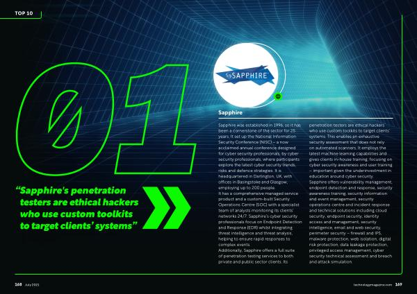 penetration testers are ethical hackers who use custom toolkits to target clients ’ systems . This enables an exhaustive security assessment that does not rely on automated scanners . It employs the latest machine learning capabilities and gives clients in-house training , focusing on cyber security awareness and user training – important given the underinvestment in education around cyber security . Sapphire offers vulnerability management , endpoint detection and response , security awareness training , security information and event management , security operations centre and incident response and technical solutions including cloud security , endpoint security , identity access and management , security intelligence , email and web security , perimeter security – firewall and IPS , malware protection , web isolation , digital risk protection , data leakage protection , privileged access management , cyber security technical assessment and breach and attack simulation . technologymagazine . com 169