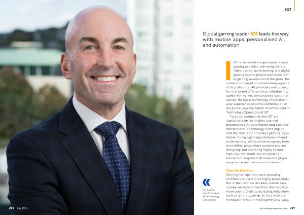 IGT is the world ’ s largest end-to-end gaming provider , delivering lottery , video , casino , sports betting , and digital gaming apps to players worldwide . Yet as gaming sweeps across the globe , the industry is focused on standardising aspects of its platforms . ‘ All providers are looking for that brand differentiator , whether it is speed-to-market , personalised customer service , the latest technology , most vibrant user experience or some combination of the above ’, says Pat Kamm , Vice President of Technology Operations at IGT .