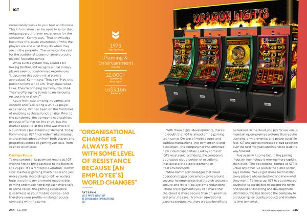 Five years will come fast . In the gaming industry , technology is moving more rapidly than ever . ‘ The operational tempo at IGT is unlike any other I ’ ve seen in the public sector ’, says Kamm . ‘ We ’ ve got more technicallysavvy players who understand and know what they want ’. To keep up , IGT has automated several of its capabilities to expand the range and speed of its testing and development . Ultimately , this has allowed the company to produce higher-quality products and shorten its time to market . technologymagazine . com 245