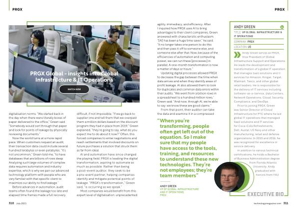 PRGX agility , immediacy , and efficiency . After I inquired how PRGX uses AI to bring advantages to their client companies , Green answered with characteristic enthusiasm . “[ AI ] has been a huge time saver ,” he said . “ It no longer takes one person to do this and then pass it off to someone else , and someone else after that . Now , because of the efficiencies of automation and computing power , we can run these [ processes ] in parallel . A one-month transformation is now a matter of days or hours .”