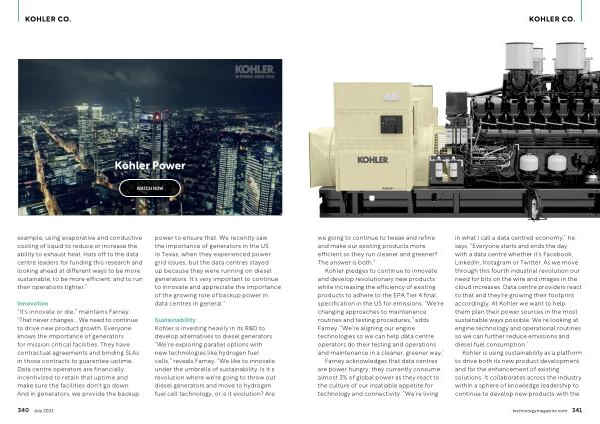 Innovation “ It ' s innovate or die ,” maintains Farney . “ That never changes ... We need to continue to drive new product growth . Everyone knows the importance of generators for mission critical facilities . They have contractual agreements and binding SLAs in those contracts to guarantee uptime . Data centre operators are financially incentivized to retain that uptime and make sure the facilities don ' t go down . And in generators , we provide the backup power to ensure that . We recently saw the importance of generators in the US in Texas , when they experienced power grid issues , but the data centres stayed up because they were running on diesel generators . It ’ s very important to continue to innovate and appreciate the importance of the growing role of backup power in data centres in general .”