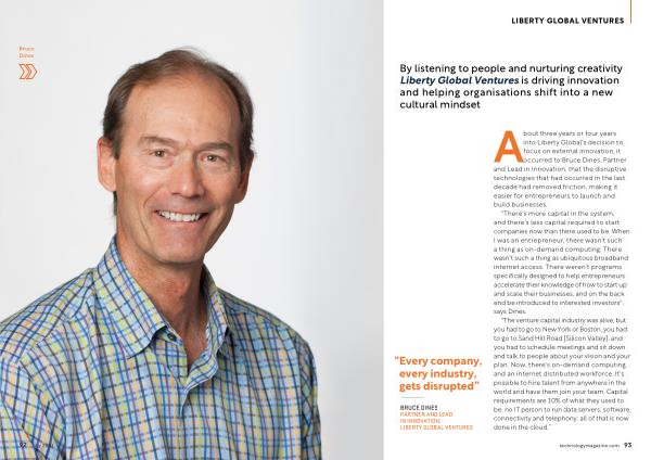 bout three years or four years into Liberty Global ' s decision to focus on external innovation , it occurred to Bruce Dines , Partner and Lead in Innovation , that the disruptive technologies that had occurred in the last decade had removed friction , making it easier for entrepreneurs to launch and build businesses .