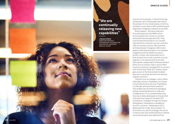 “ Partners such as Flexagon , which offers a DevOps solution , FlexDeploy , for Oracle Cloud infrastructure services . FlexDeploy is a DevOps and automation platform that enables fast and efficient packaging , testing , and development of code and configurations . It ’ s a complimentary tool that was initially developed on Oracle SOA Suite and now supports the latest OCI architecture . Available through the Oracle Marketplace , FlexDeploy is available to any OCI customer .” Asked about OIC ’ s global partner model , Kress shared , “ To summarise our partner strategy , the secret is that we train and certify partners to deliver successful projects and replicate their