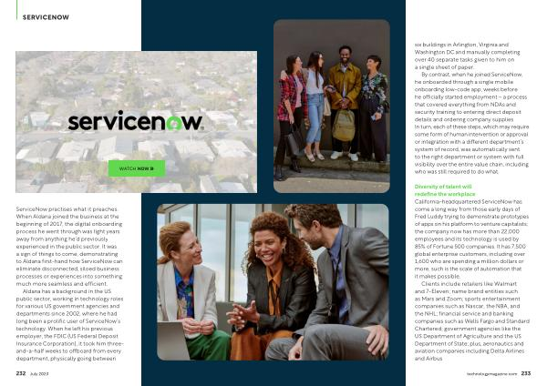 Diversity of talent will redefine the workplace California-headquartered ServiceNow has come a long way from those early days of Fred Luddy trying to demonstrate prototypes of apps on his platform to venture capitalists ; the company now has more than 22,000 employees and its technology is used by 85 % of Fortune 500 companies . It has 7,500 global enterprise customers , including over 1,600 who are spending a million dollars or more , such is the scale of automation that it makes possible .