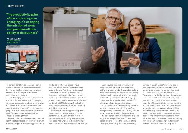 Service : it used ServiceNow ’ s low-code App Engine to automate a compliance examination process for farmers that used to take six weeks in total to complete . The process involved examining the exposure to insurance risk that farmers faced , so it was mission critical . With ServiceNow ’ s help , the USDA was able to get this timeline from six weeks down to 30 minutes ! As well as the obvious cost savings ( about US $ 3m a year in total ), this allows the USDA to be more proactive and to offer more frequent inspections , which in turn will make them more effective . Low-code is truly transforming how the USDA can accomplish its mission and the services it can offer the public .