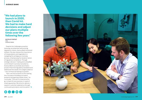 “ Now , we find ourselves at the starting line , focused on building our brand presence and gaining market share ,” he concludes . “ Our aim is to become the go-to bank for any business in need of a bank guarantee . We strive to deliver a superior customer experience through continued automation and innovation .” 198 July 2024