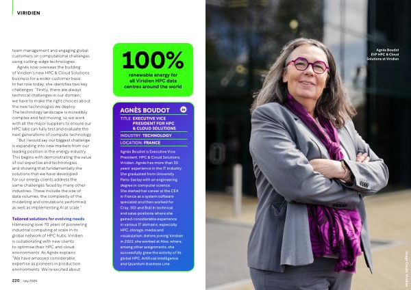 Agnès Boudot is Executive Vice President , HPC & Cloud Solutions , Viridien . Agnès has more than 30 years ’ experience in the IT industry . She graduated from University Paris-Saclay with an engineering degree in computer science . She started her career at the CEA in France as a system software specialist and then worked for Cray , SGI and Bull in technical and sales positions where she gained considerable experience in various IT domains , especially HPC , storage , media and visualization . Before joining Viridien in 2022 , she worked at Atos , where , among other assignments , she successfully grew the activity of its global HPC , Artificial Intelligence and Quantum Business Line .