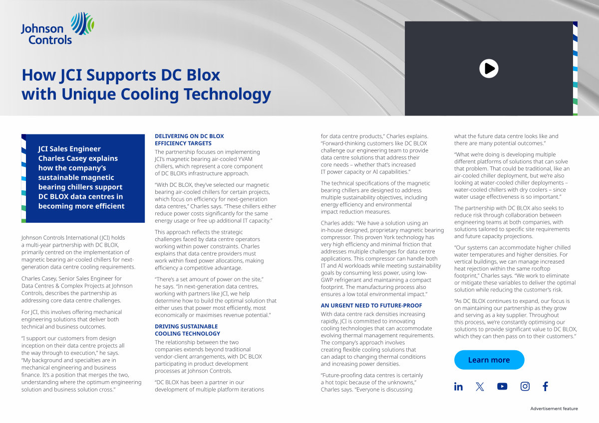 Johnson Controls International( JCI) holds a multi-year partnership with DC BLOX, primarily centred on the implementation of magnetic bearing air-cooled chillers for nextgeneration data centre cooling requirements.