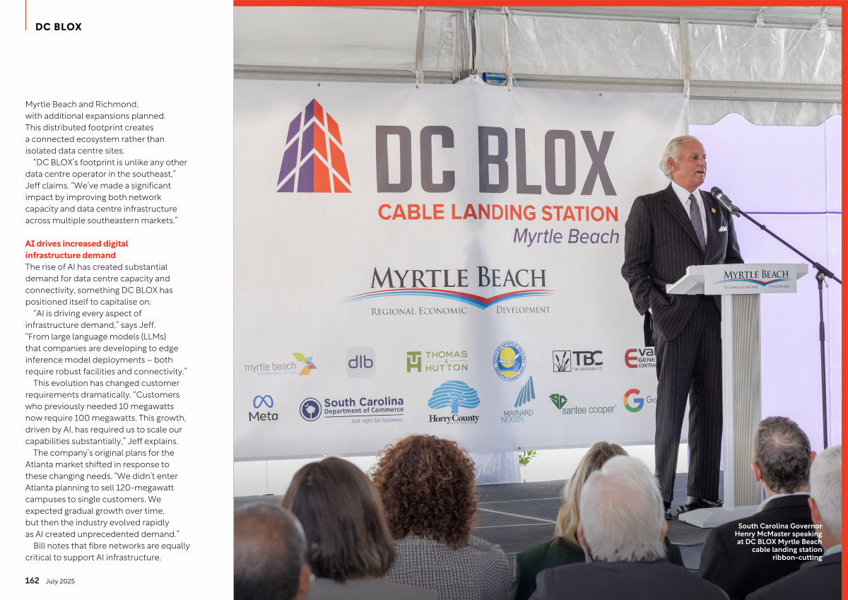 “ DC BLOX’ s footprint is unlike any other data centre operator in the southeast,” Jeff claims.“ We’ ve made a significant impact by improving both network capacity and data centre infrastructure across multiple southeastern markets.”