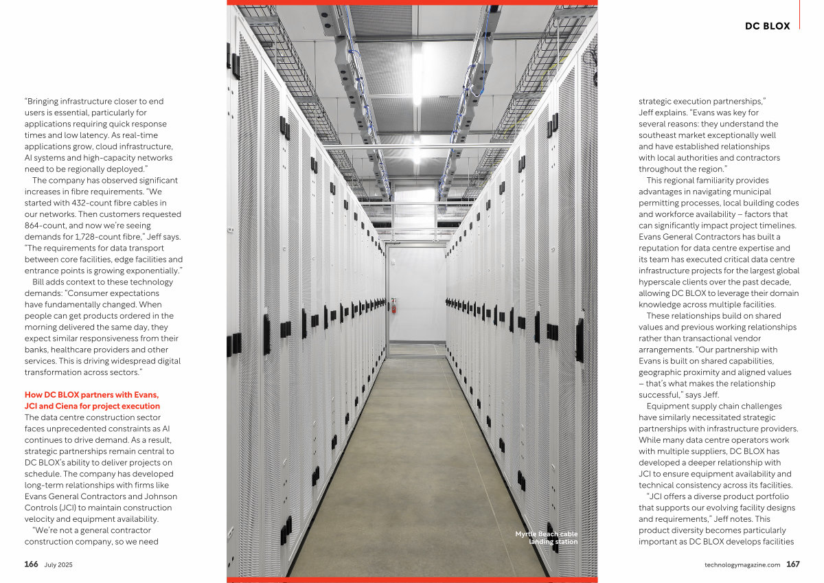 Equipment supply chain challenges have similarly necessitated strategic partnerships with infrastructure providers. While many data centre operators work with multiple suppliers, DC BLOX has developed a deeper relationship with JCI to ensure equipment availability and technical consistency across its facilities.