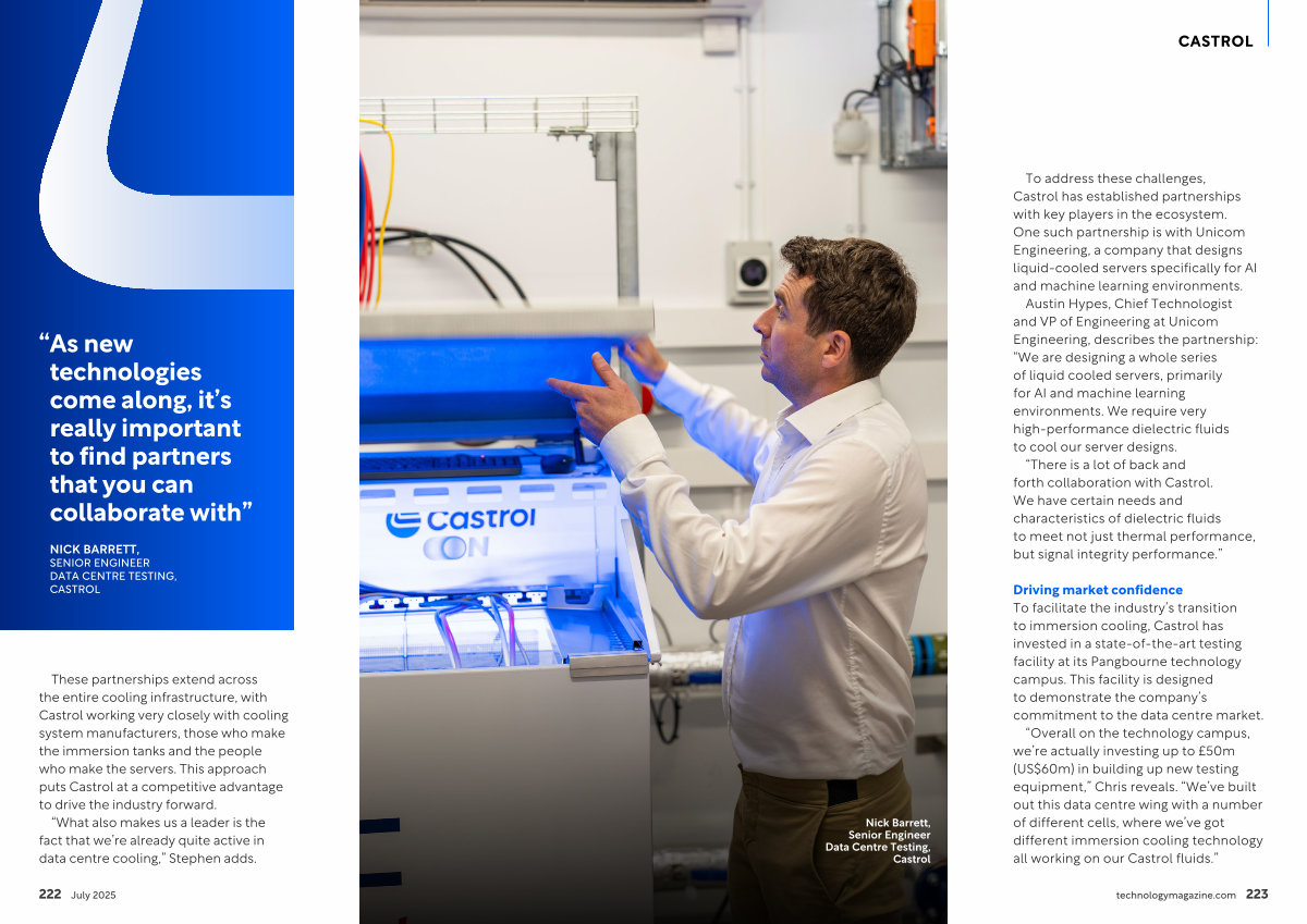 These partnerships extend across the entire cooling infrastructure, with Castrol working very closely with cooling system manufacturers, those who make the immersion tanks and the people who make the servers. This approach puts Castrol at a competitive advantage to drive the industry forward.