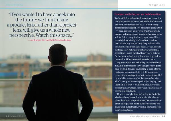 “ Before thinking about technology partners , it ’ s really important for you to look at the fundamental question of buy versus build . I think in many companies this decision tree has almost got reversed . “ There has been a universal frustration with internal technology departments perhaps not being able to deliver as quickly as people would like , certainly historically , and so there is a draw towards the buy . So , you buy the product and it doesn ’ t exactly match your needs , so you need to customise it . That customisation process takes some time – you ’ ll eventually get there , but any further customisation is going to be a trip back to the vendor . This can sometimes take years . “ My proposition is to look at buy versus build with a slightly different lens . First thing is , you ’ ve got to have credible delivery . So , looking at our platform , that gives us our credibility . If it ’ s a source of competitive advantage , then by its nature it shouldn ’ t be available anywhere else , because otherwise what ’ s to stop another competitor just buying it off the shelf . If it truly is a differentiator , a source of competitive advantage , then you should look really carefully at building it . “ However , our platform isn ’ t solely for the individuals and engineers that work in Manchester . We ’ ve developed our platform so that we can have other third parties doing the development . We could use a hybrid team , we could use teams split over two locations .”