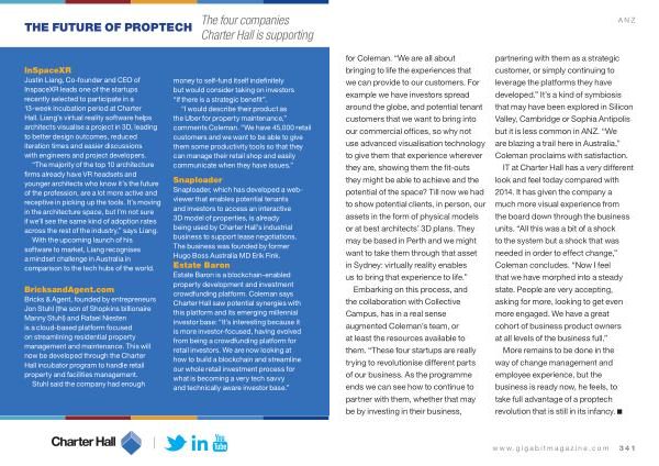 ANZ for Coleman . “ We are all about bringing to life the experiences that we can provide to our customers . For example we have investors spread around the globe , and potential tenant customers that we want to bring into our commercial offices , so why not use advanced visualisation technology to give them that experience wherever they are , showing them the fit-outs they might be able to achieve and the potential of the space ? Till now we had to show potential clients , in person , our assets in the form of physical models or at best architects ’ 3D plans . They may be based in Perth and we might want to take them through that asset in Sydney : virtually reality enables us to bring that experience to life .”