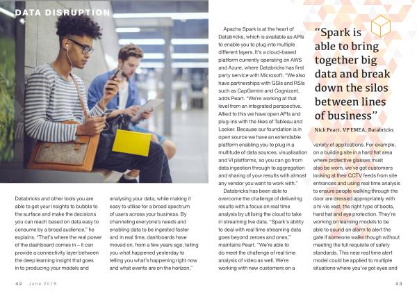 Apache Spark is at the heart of Databricks , which is available as APIs to enable you to plug into multiple different layers . It ’ s a cloud-based platform currently operating on AWS and Azure , where Databricks has first party service with Microsoft . “ We also have partnerships with GSIs and RSIs such as CapGemini and Cognizant , adds Peart . “ We ’ re working at that level from an integrated perspective . Allied to this we have open APIs and plug-ins with the likes of Tableau and Looker . Because our foundation is in open source we have an extendable platform enabling you to plug in a multitude of data sources , visualisation and VI platforms , so you can go from data ingestion through to aggregation and sharing of your results with almost any vendor you want to work with .”