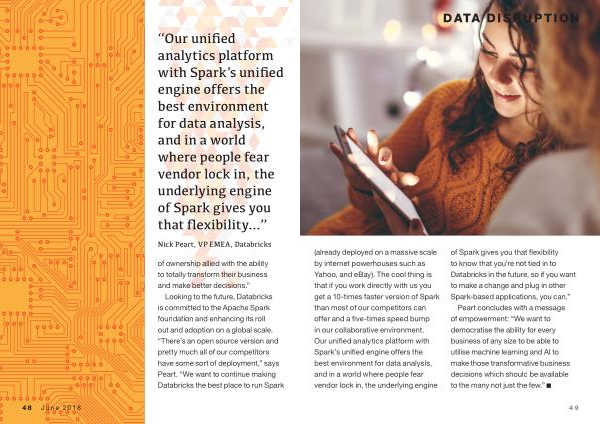 ( already deployed on a massive scale by internet powerhouses such as Yahoo , and eBay ). The cool thing is that if you work directly with us you get a 10-times faster version of Spark than most of our competitors can offer and a five-times speed bump in our collaborative environment . Our unified analytics platform with Spark ’ s unified engine offers the best environment for data analysis , and in a world where people fear vendor lock in , the underlying engine of Spark gives you that flexibility to know that you ’ re not tied in to Databricks in the future , so if you want to make a change and plug in other Spark-based applications , you can .”