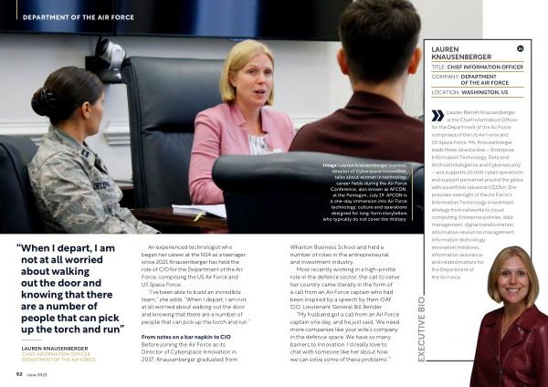 Lauren Barrett Knausenberger is the Chief Information Officer for the Department of the Air Force , comprised of the US Air Force and US Space Force . Ms . Knausenberger leads three directorates – Enterprise Information Technology , Data and Artificial Intelligence and Cybersecurity – and supports 20,000 cyber operations and support personnel around the globe with a portfolio valued at U $ 17bn . She provides oversight of the Air Force ’ s Information Technology investment strategy from networks to cloud computing , Enterprise policies , data management , digital transformation , information resources management , information technology innovation initiatives , information assurance and related matters for the Department of the Air Force .