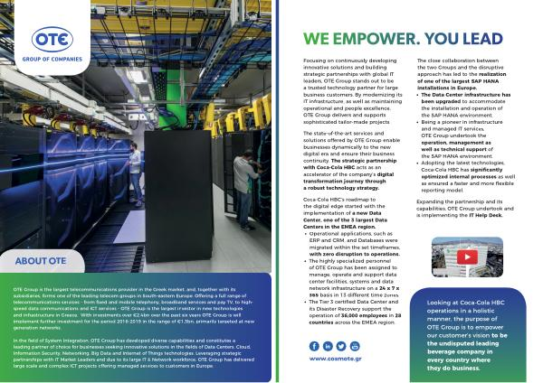In the field of System Integration , OTE Group has developed diverse capabilities and constitutes a leading partner of choice for businesses seeking innovative solutions in the fields of Data Centers , Cloud , Information Security , Networking , Big Data and Internet of Things technologies . Leveraging strategic partnerships with IT Market Leaders and due to its large IT & Network workforce , OTE Group has delivered large scale and complex ICT projects offering managed services to customers in Europe .