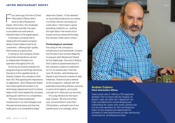 Driven by an inherent passion for programming and all things technical , this job is in the capable hands of Andres Cubero , the company ’ s firstever CIO . Recognizing the importance of digitization , Jetro Restaurant Depot has made significant strides in its technology department and it is these steps which have helped the company distinguish itself from its competitors .