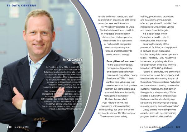 Four pillars of success “ In the data center space , having no outages is key and uptime and safety are paramount ,” says Mike Casey , President at T5FM . “ I think our four core values are just one element that distinguishes us from our competitors as a successful data center facility management company .” Built on the so-called ‘ Four Pillars of T5FM ,’ the company ’ s unique operating methodology has been one of the key accelerators of T5FM ’ s success .