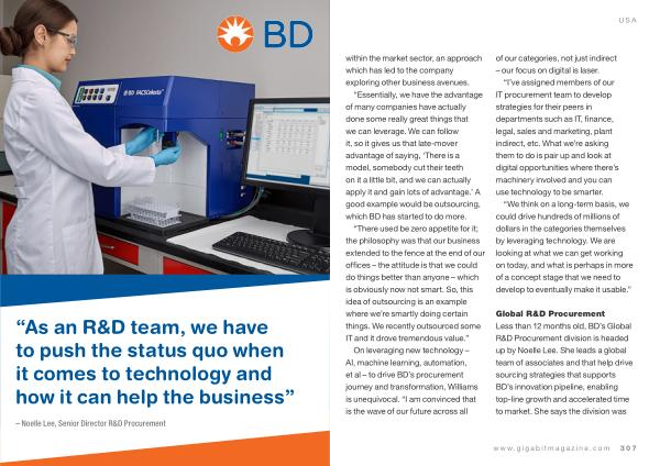 Global R & D Procurement Less than 12 months old , BD ’ s Global R & D Procurement division is headed up by Noelle Lee . She leads a global team of associates and that help drive sourcing strategies that supports BD ’ s innovation pipeline , enabling top-line growth and accelerated time to market . She says the division was
