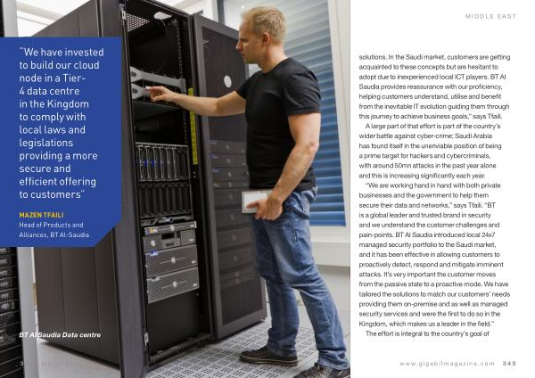 “ We are working hand in hand with both private businesses and the government to help them secure their data and networks ,” says Tfaili . “ BT is a global leader and trusted brand in security and we understand the customer challenges and pain-points . BT Al Saudia introduced local 24x7 managed security portfolio to the Saudi market , and it has been effective in allowing customers to proactively detect , respond and mitigate imminent attacks . It ’ s very important the customer moves from the passive state to a proactive mode . We have tailored the solutions to match our customers ’ needs providing them on-premise and as well as managed security services and were the first to do so in the Kingdom , which makes us a leader in the field .”