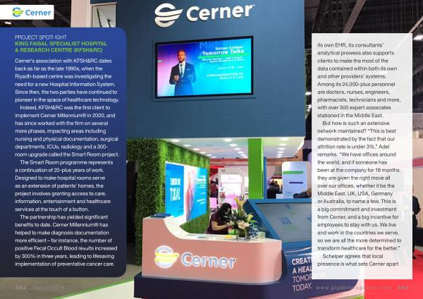 But how is such an extensive network maintained ? “ This is best demonstrated by the fact that our attrition rate is under 3 %,” Adel remarks . “ We have offices around the world , and if someone has been at the company for 18 months they are given the right move all over our offices , whether it be the Middle East , UK , USA , Germany or Australia , to name a few . This is a big commitment and investment from Cerner , and a big incentive for employees to stay with us . We live and work in the countries we serve , so we are all the more determined to transform healthcare for the better .”