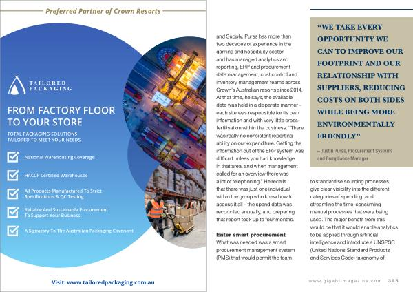 “ WE TAKE EVERY and Supply . Purss has more than two decades of experience in the gaming and hospitality sector and has managed analytics and reporting , ERP and procurement data management , cost control and inventory management teams across Crown ’ s Australian resorts since 2014 . At that time , he says , the available data was held in a disparate manner – each site was responsible for its own information and with very little crossfertilisation within the business . “ There was really no consistent reporting ability on our expenditure . Getting the information out of the ERP system was difficult unless you had knowledge in that area , and when management called for an overview there was a lot of telephoning .” He recalls that there was just one individual within the group who knew how to access it all – the spend data was reconciled annually , and preparing that report took up to four months .