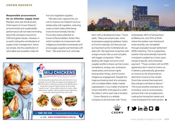 ANZ them with a development plan ,” Purss adds . “ Many are small scale , niche businesses supplying seafood , herbs or fruit for example , but they are just as important as the multinationals we deal with . We help them to partner with a large concern like us and compete with bigger companies .” When dealing with larger concerns a full supplier profile is drawn up that covers compliance , energy use , emissions , waste policy and human rights among other things , and of course indigenous engagement . Despite the huge purchasing clout of a company with a multiple billion-dollar market capitalisation , it is a matter of pride for Crown that 90 % of its spend is within the state in which each site is located .