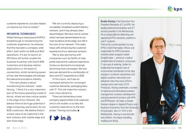 Bouke Hoving is the Executive Vice President Networks & IT at KPN , the leading telecommunications and ICT service provider in the Netherlands . He is responsible for delivering and operating KPN ’ s networks , platforms and IT systems . Prior to his current position he was KPN ’ s Chief Information Officer and responsible for KPN ’ s business transformation program called Simplification – aimed at a radical simplification of products , processes , IT and way of working . Under his leadership the program was of instrumental contribution to the step change in customer satisfaction and digital customer interaction and delivered more than euro 500mn savings since start early 2014 . Previously , Hoving undertook a number of national and international product management , business development and procurement functions with KPN and KPNQwest . He holds a Double Honours degree in Applied Physics and Business Economics from the University of Groningen . Born in 1975 in the Netherlands , Hoving is married with two children . He enjoys travelling , reading and skiing . www . gigabitmagazine . com 99
