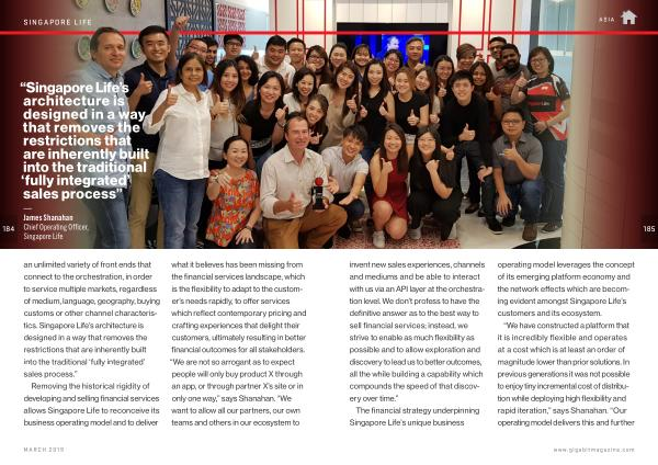Removing the historical rigidity of developing and selling financial services allows Singapore Life to reconceive its business operating model and to deliver what it believes has been missing from the financial services landscape , which is the flexibility to adapt to the customer ’ s needs rapidly , to offer services which reflect contemporary pricing and crafting experiences that delight their customers , ultimately resulting in better financial outcomes for all stakeholders . “ We are not so arrogant as to expect people will only buy product X through an app , or through partner X ’ s site or in only one way ,” says Shanahan . “ We want to allow all our partners , our own teams and others in our ecosystem to