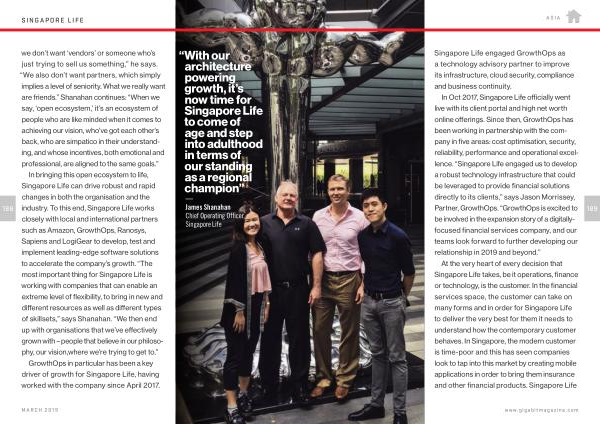 In Oct 2017 , Singapore Life officially went live with its client portal and high net worth online offerings . Since then , GrowthOps has been working in partnership with the company in five areas : cost optimisation , security , reliability , performance and operational excellence . “ Singapore Life engaged us to develop a robust technology infrastructure that could be leveraged to provide financial solutions directly to its clients ,” says Jason Morrissey , Partner , GrowthOps . “ GrowthOps is excited to be involved in the expansion story of a digitallyfocused financial services company , and our teams look forward to further developing our relationship in 2019 and beyond .”