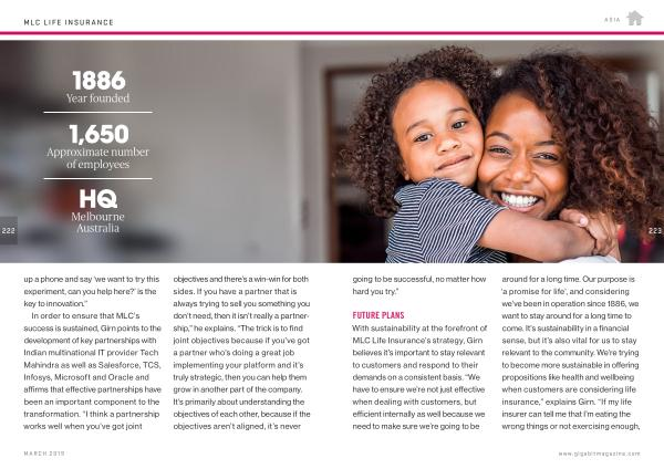 In order to ensure that MLC ’ s success is sustained , Girn points to the development of key partnerships with Indian multinational IT provider Tech Mahindra as well as Salesforce , TCS , Infosys , Microsoft and Oracle and affirms that effective partnerships have been an important component to the transformation . “ I think a partnership works well when you ’ ve got joint objectives and there ’ s a win-win for both sides . If you have a partner that is always trying to sell you something you don ’ t need , then it isn ’ t really a partnership ,” he explains . “ The trick is to find joint objectives because if you ’ ve got a partner who ’ s doing a great job implementing your platform and it ’ s truly strategic , then you can help them grow in another part of the company . It ’ s primarily about understanding the objectives of each other , because if the objectives aren ’ t aligned , it ’ s never